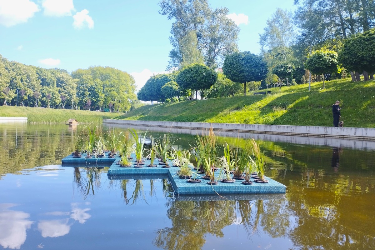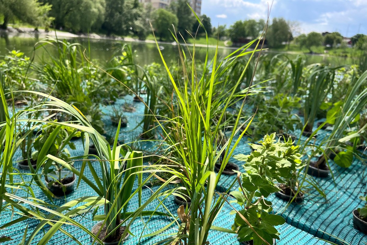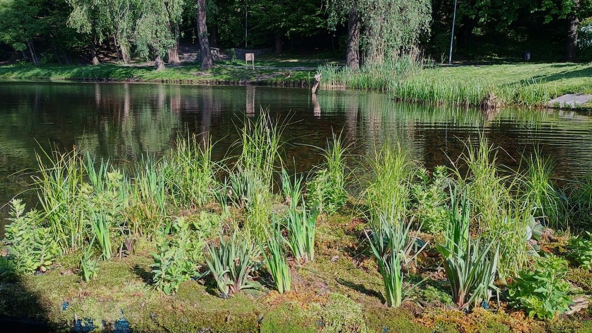 Легкі платформи на поверхні водойм засаджено вологолюбними рослинами: очеретом, рогозом, ірисом болотним, м’ятою водяною, осокою тощо.