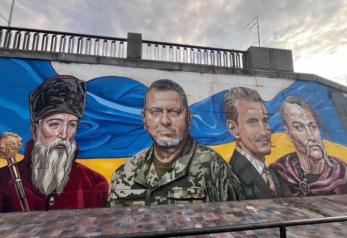 У Києві на Дніпровській набережній з’явився великий мурал із історичними діячами України. В центрі — генерал Валерій Залужний. Також на малюнку — Святослав Хоробрий, Петро Сагайдачний і Дмитро Донцов.
