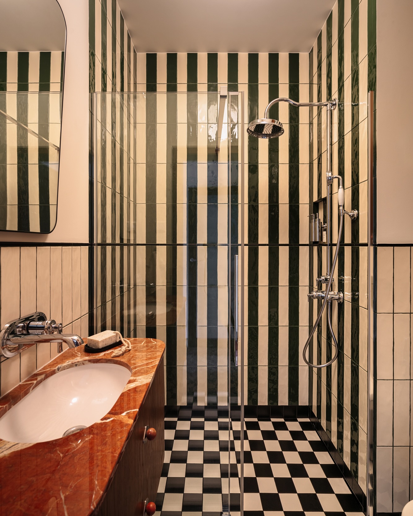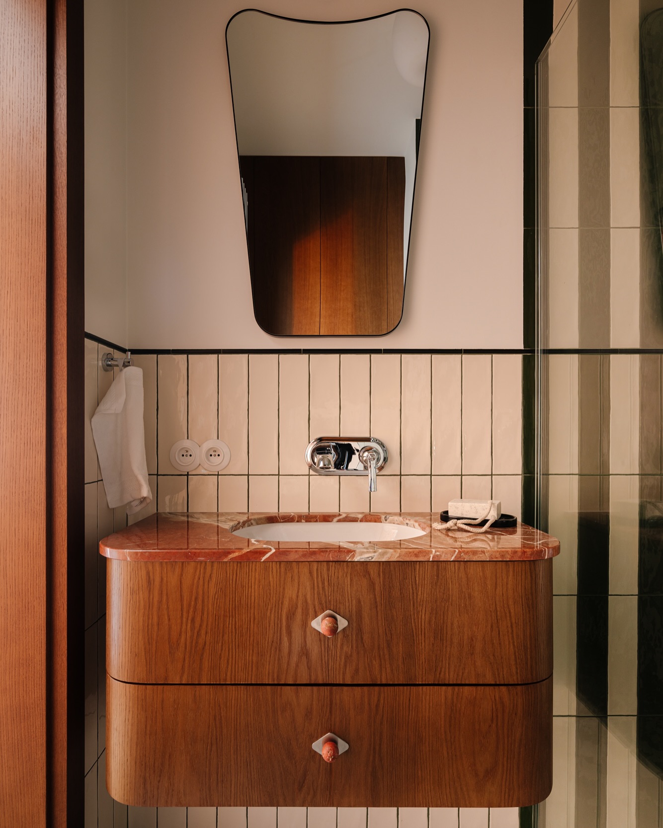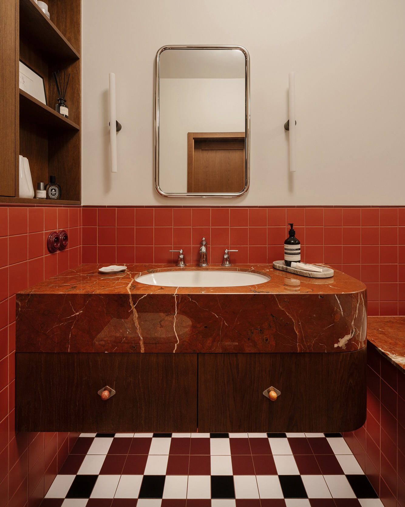 У ванних кімнатах розмістили дерев’яні меблі зі стільницями з червоного мармуру у стилі ретро.