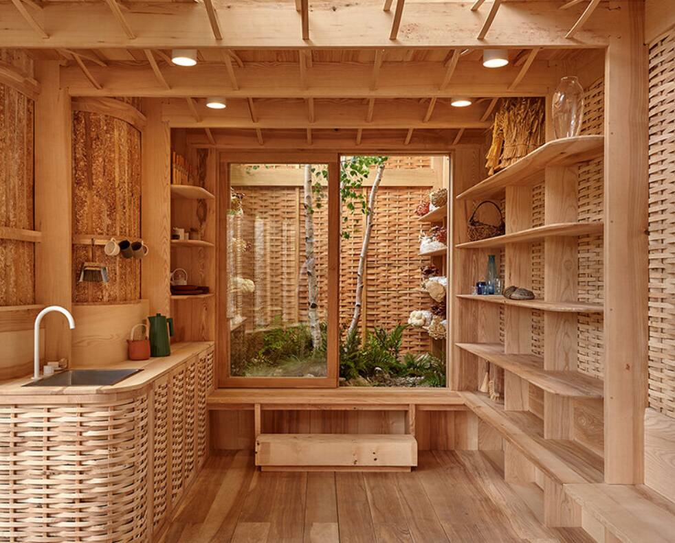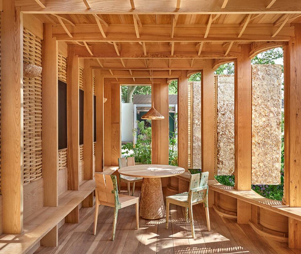 Будівля всередині «розумного» саду побудована з матеріалів, що розповідають свої власні історії. Наприклад для створення зовнішньої оболонки використані гілки ясеня, які були зібрані з хворих дерев у місцевих лісах. Природне світло проникає між дерев’яними планками, підсвічуючи панелі з міцелію грибів, вирощених на сільськогосподарських відходах — це дозволяє саду матий такий вигляд, ніби він виріс, а не був побудований.