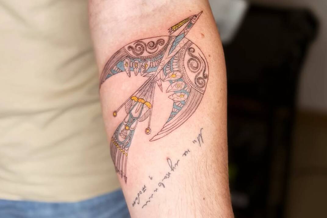 Дмитро Кулеба, колишній міністр закордонних справ України, зробив татуювання з фрагментом мозаїки Алли Горської «Боривітер». Фото татуювання він показав у соцмережах.