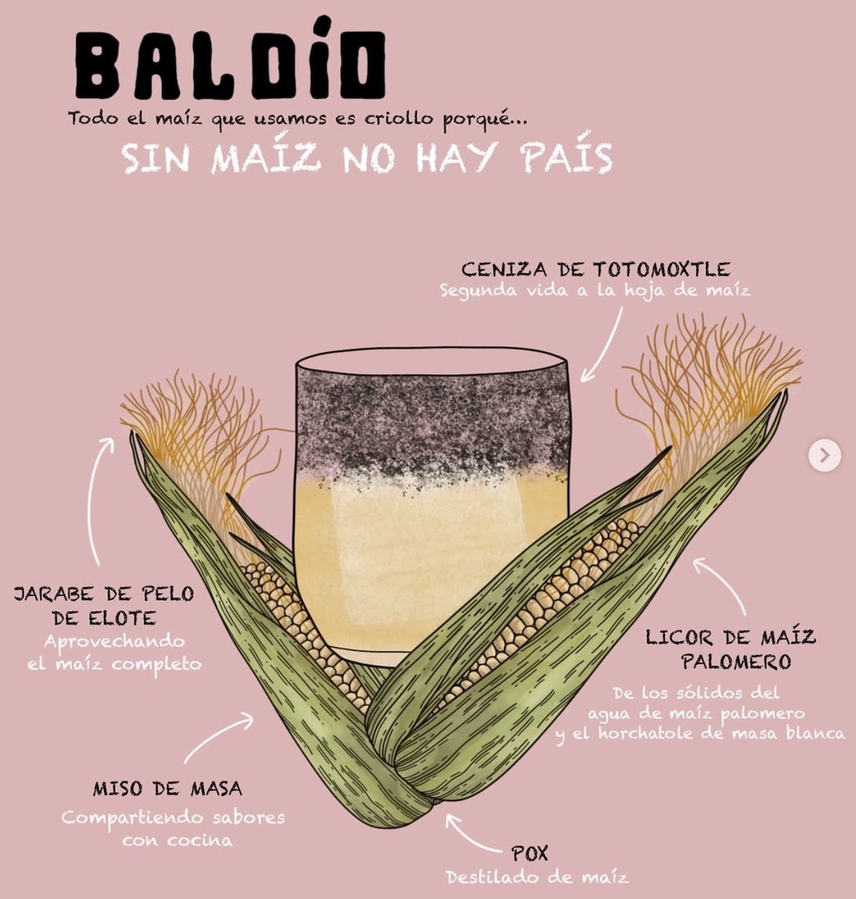 Baldío пропонує мексиканську кухню з творчим підходом: кабачкова тостада з броколі-моле; квітки магей (нерозкриті бутони агави); гусінь із цих квіток (можливо, ви бачили такого черва у пляшці з мескалем); м’ясо свині, що вирощувалася на вільному випасі, з тамаріндовим соусом і домашнім кімчі; севіче зі свіжовиловленої риби.