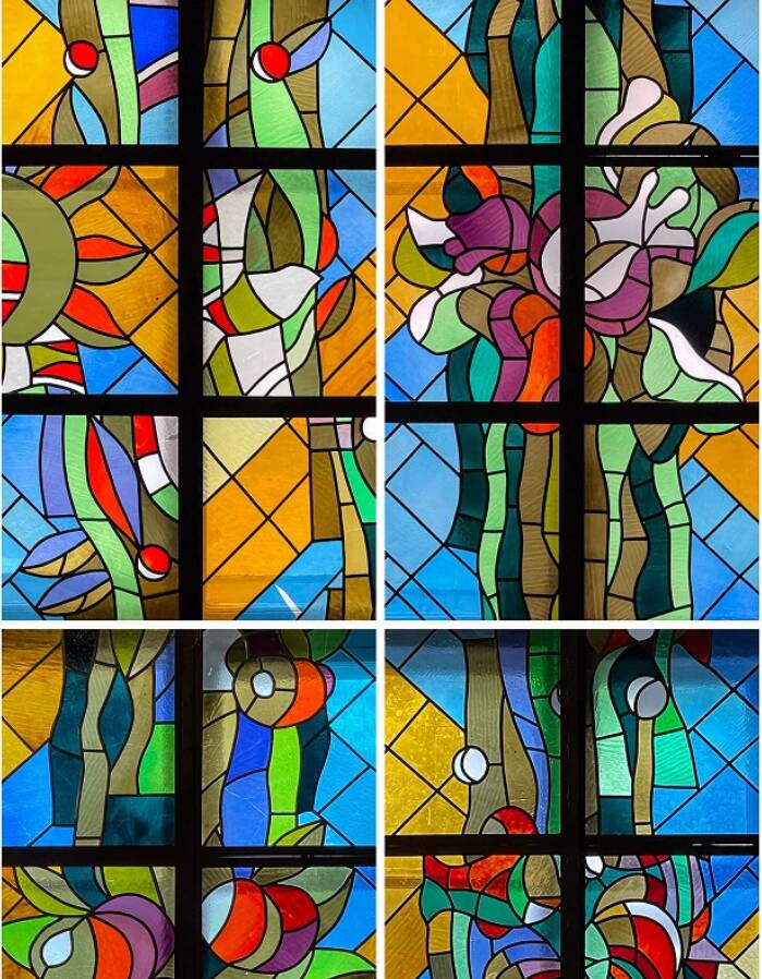 Про авторів вітражів наразі нічого не відомо, але імовірніше, що вітраж з квітами на жовто-блакитному тлі був створений на початку 1980-х.