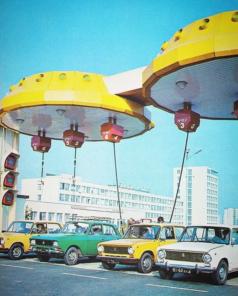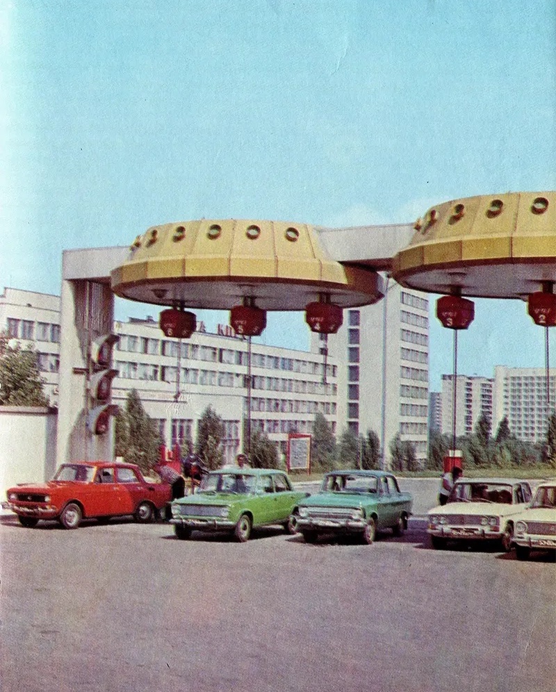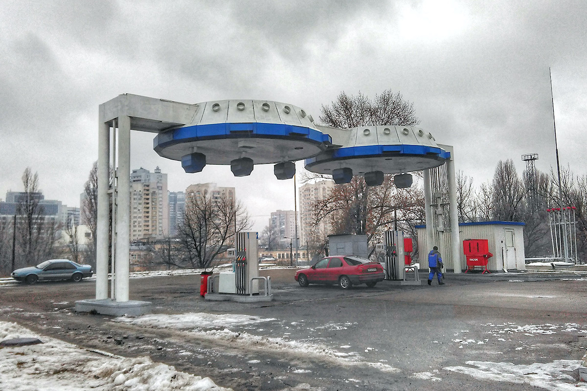 Дві такі АЗС збудували у Києві наприкінці 1970-х років — на Броварському проспекті 53 і Харківському шосе 68. Із них донедавна зберіглася лише одна.