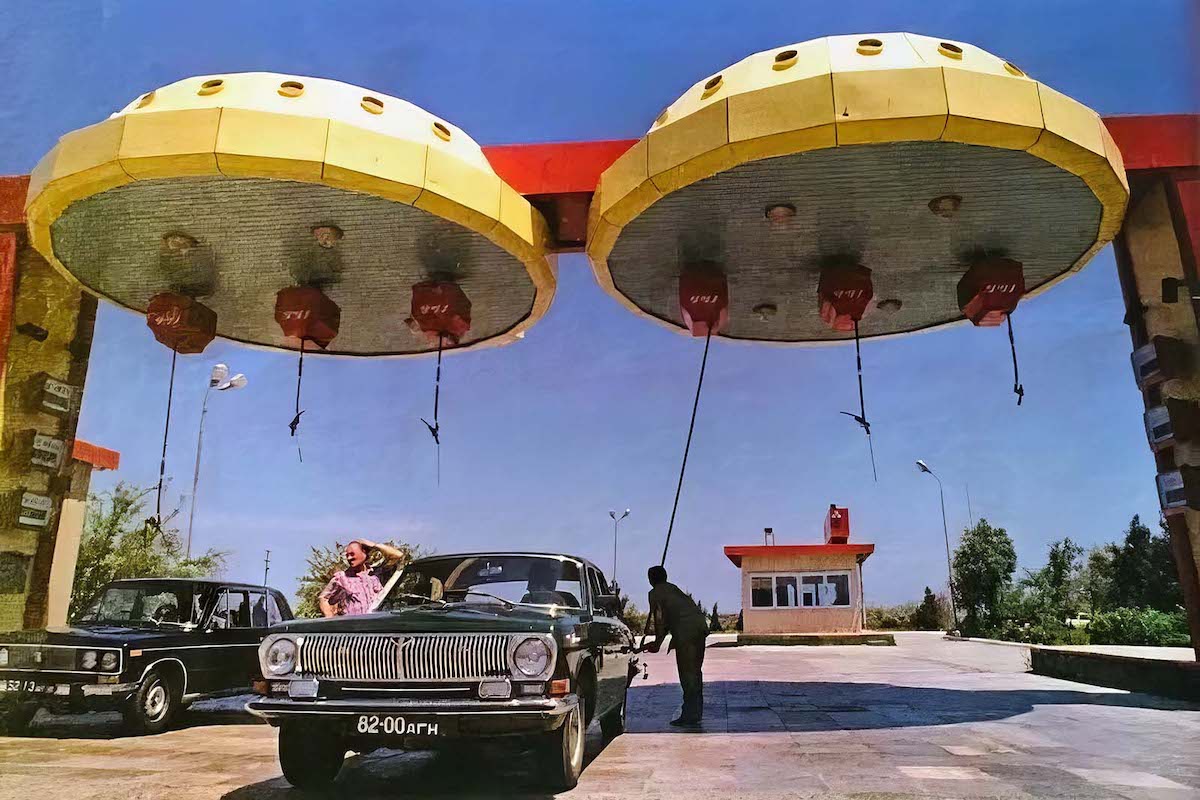 Судячи з доступної в мережі інформації, саме такий дизайн заправок був характерним для радянських міст, а ідентичних із Японії знайти не вдається. На фото нижче — аналогічна київським станція у Баку, Азербайджанська РСР: