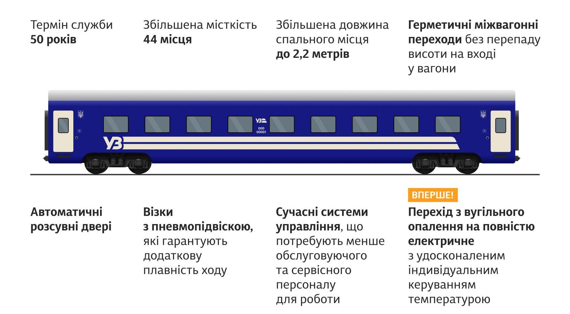 Вагони будуть купейними з можливістю трансформації у вагони типу СВ. Вони вміщатимуть більше пасажирів — до 44 в одному купейному вагоні (зараз — 40). Завдяки ширшому кузову довжину спального місця можна подовжити до 2,2 метра. Вагони матимуть автоматичні розсувні двері та герметичні міжвагонні переходи врівень з підлогою.