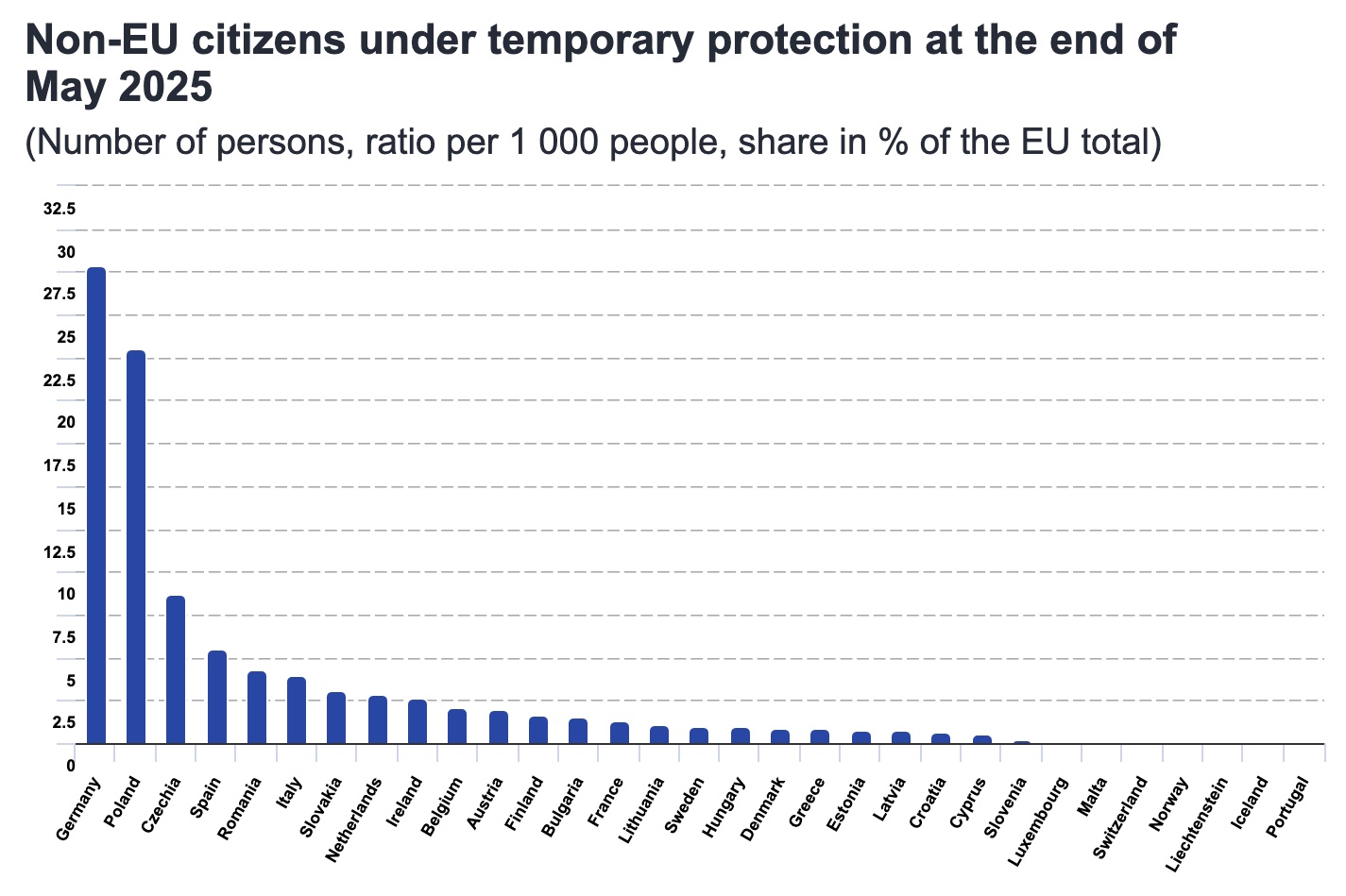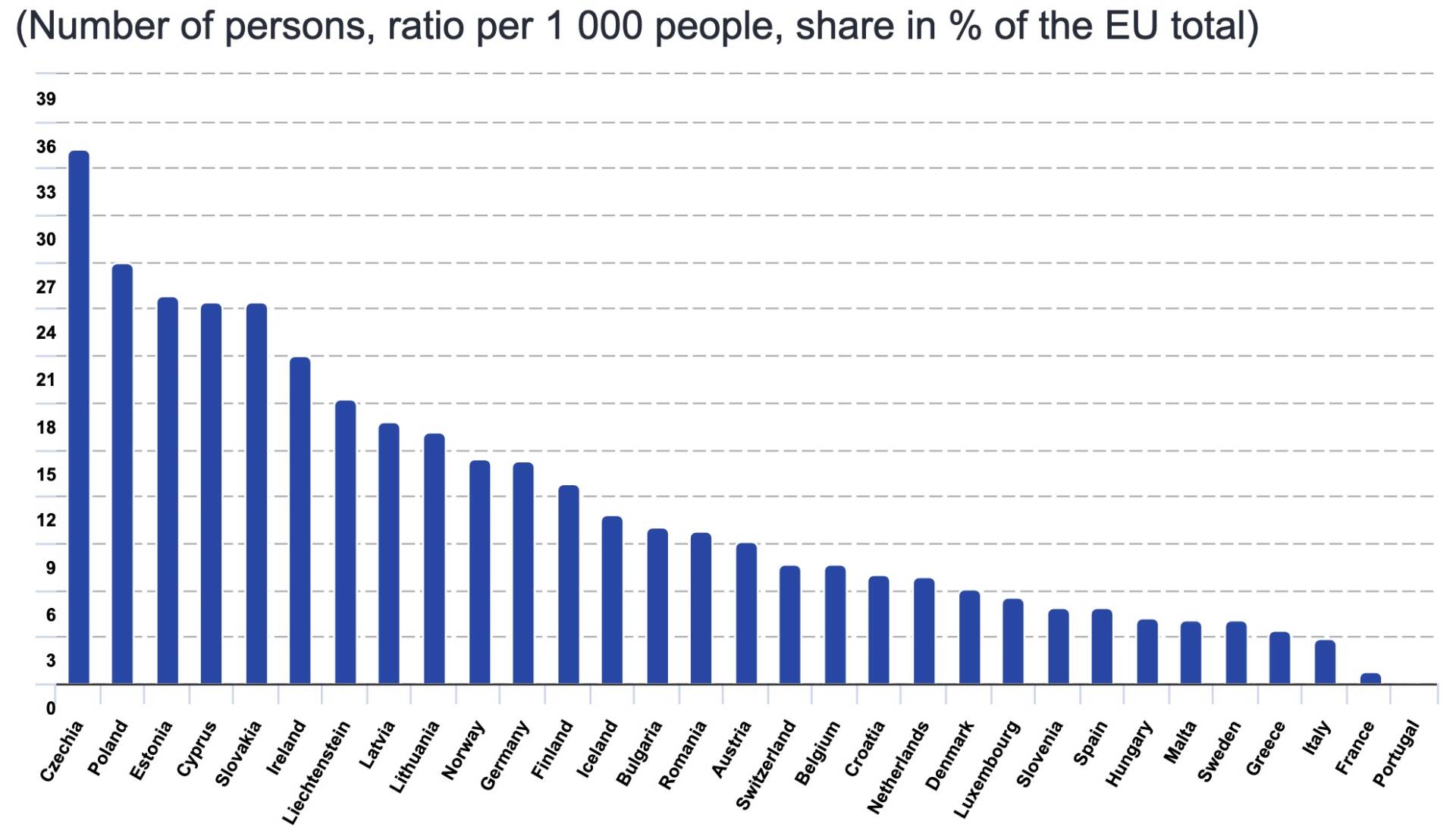 У перерахунку на населення приймаючої країни українські біженці наразі становлять 3,4% від усього населення Чехії, 2,7% Польщі та 2,5% Естонії.