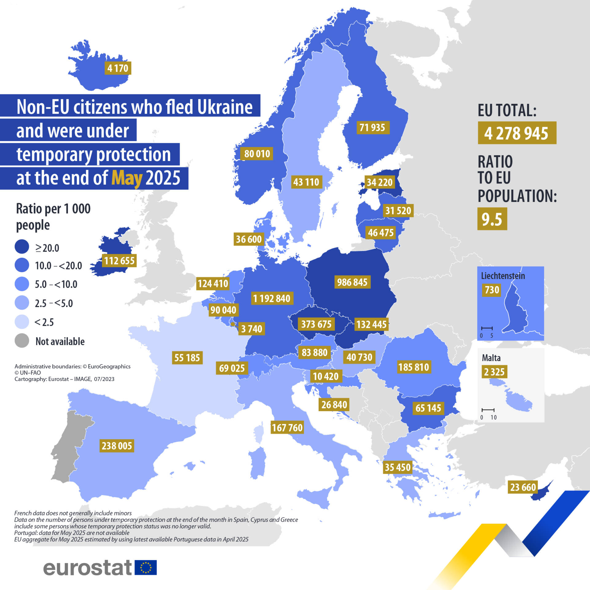 Станом на початок літа цього року в Євросоюзі налічувалося 4,28 мільйонів біженців, які оформили тимчасовий захист. Люди з таким статусом є майже виключно громадянами України, повідомляє Євростат.