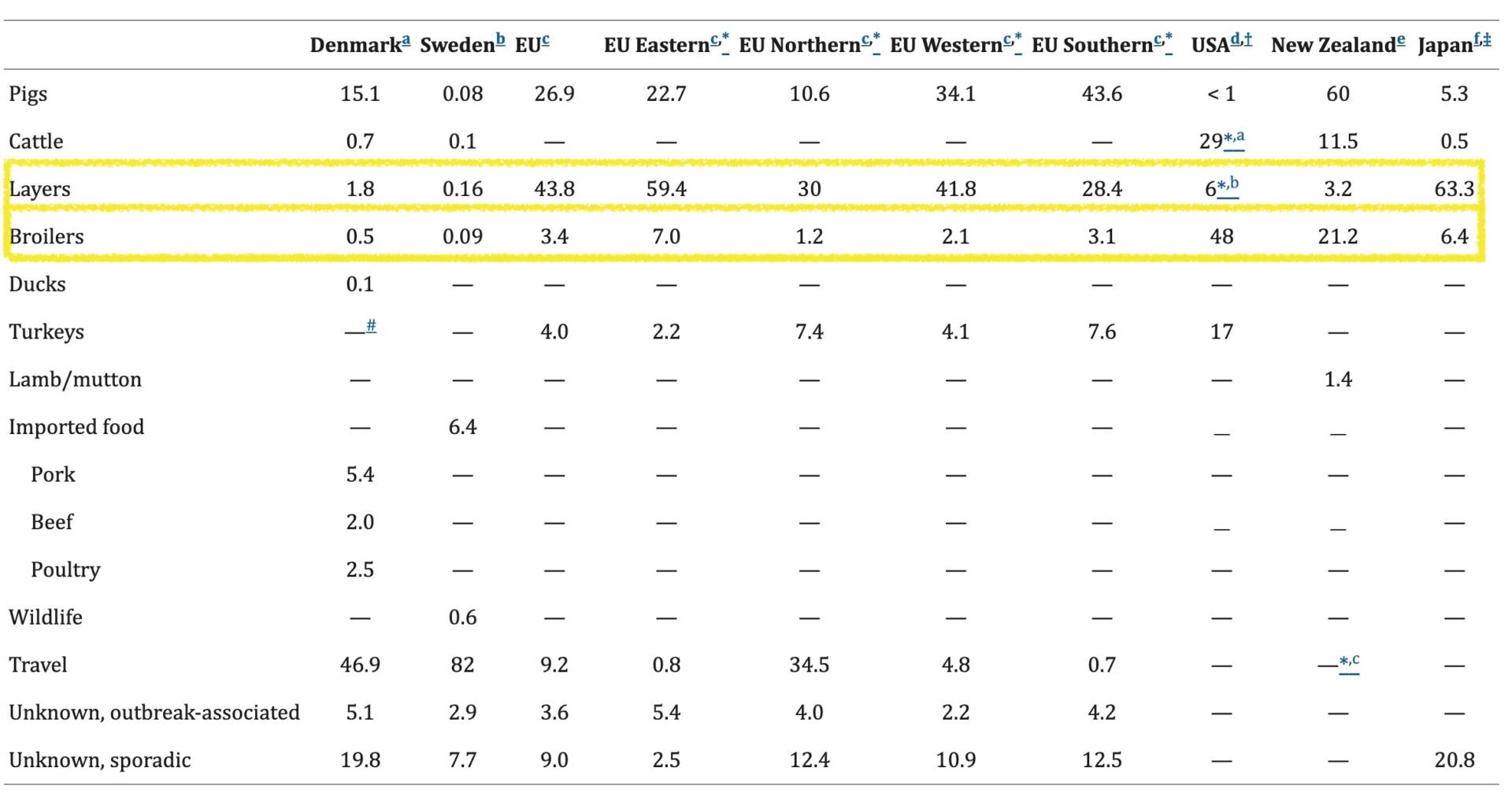Так, у Східній Європі курчата яєчних порід відповідають за 60% випадків сальмонельозу, курчата м’ясних порід — за 7%.