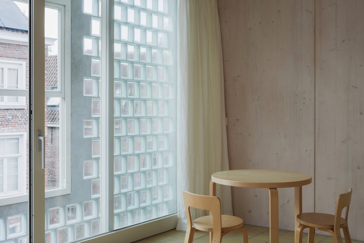 Триповерховий будинок площею 98 квадратних метрів займає ділянку між трьома будівлями. Для проєктувальників Delmulle Delmulle Architecten це означало, що вікна можуть виходити лише на один бік. Рішенням став напівпрозорий фасад на двох верхніх поверхах.