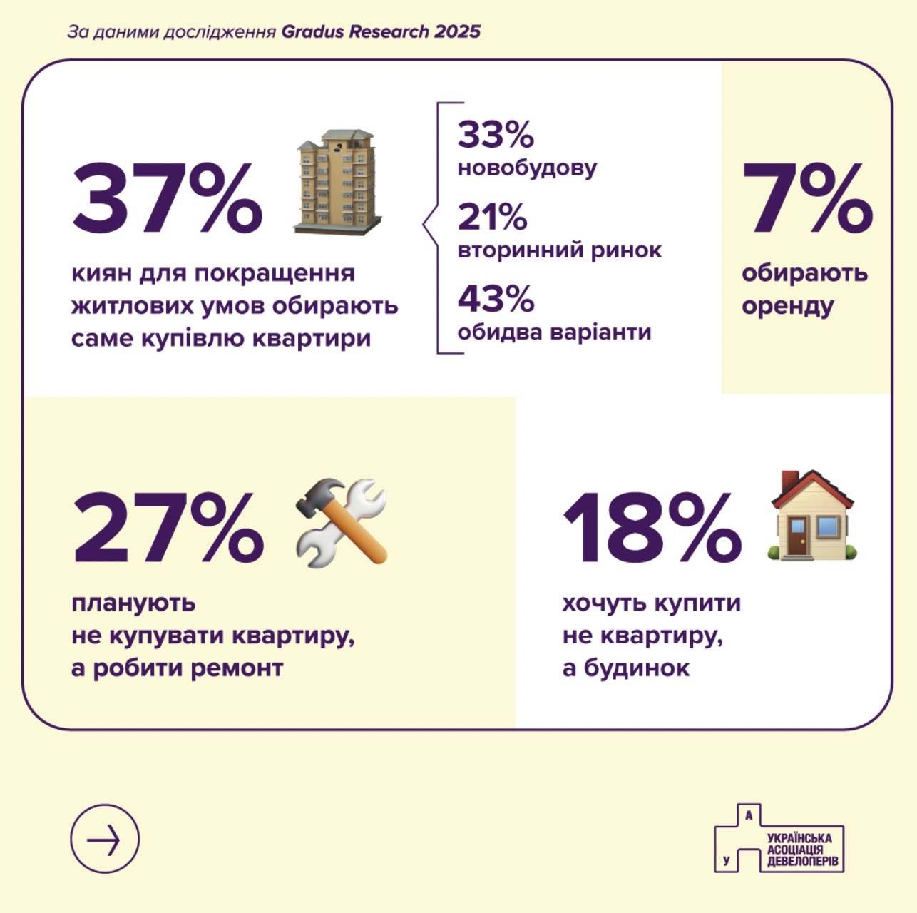 33% заявили про готовність придбати житло в новобудові; 21% орієнтуються на вторинний ринок; 43% розглядають обидва варіанти.