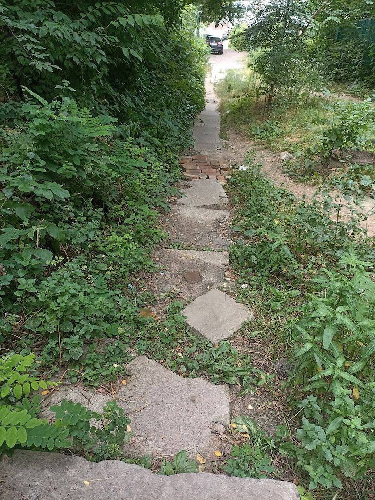 Вниз до метро вів вузький спуск, який мешканці, за словами депутатки, називали «козиною стежкою». Під час будівництва нового ЖК там встановили дерев’яні галереї, які з роками поруйнувалися та прогнили, що зробило прохід ще незручнішим. До того ж, будівельна техніка пошкодила асфальт.
