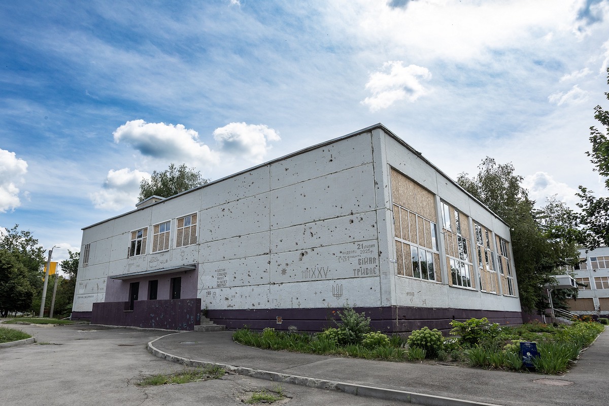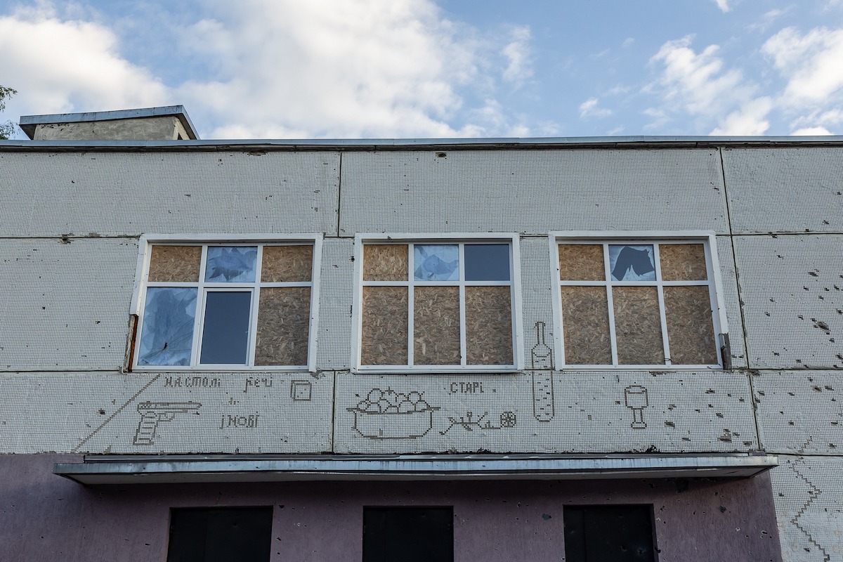 Після спілкування з мешканцями Салтівки Віталій Кохан, шукаючи місце для проєкту, зупинився на пошкодженій обстрілами школі. Її планують відновити. Учні зараз навчаються дистанційно.