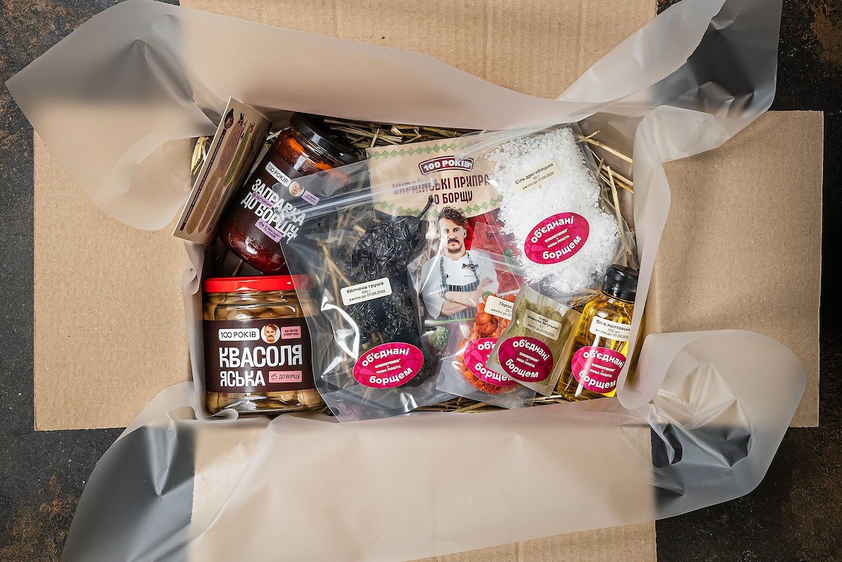 Набір коштує 1000 гривень, зате доставка безкоштовна. У пакунок входять два типи продуктів. Перший — це «інгредієнти єдності»: пакетик із кількома копченими грушами, спеції, пакетик солі, банка квасолі та банка заправки.