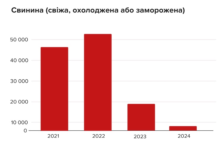 Найменше імпорту серед молочних продуктів, мʼяса, ковбас. Торік імпорт свинини порівняно з довоєнним періодом зменшився у 20 разів.
