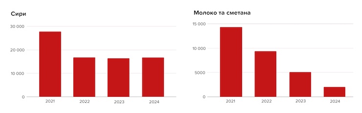 Молоко. «Поляки тіснили українських виробників на ринку (молочних продуктів) до 2022 року», — зазначає Павло Мартишев, експерт з агропродовольчих ринків. Якщо у 2021 році в Україну завезли 11 тисяч тонн польського молока, то торік приїхала менш як 1 тисяча тонн. Масла завозять втричі менше. На це вплинула, зокрема, девальвація гривні: закуповувати товар стає дорожче, ніж виробляти його на місці. Але також зросло й місцеве виробництво молока: темпи його приросту від початку 2025 року були одними з найвищих у Європі та світі.