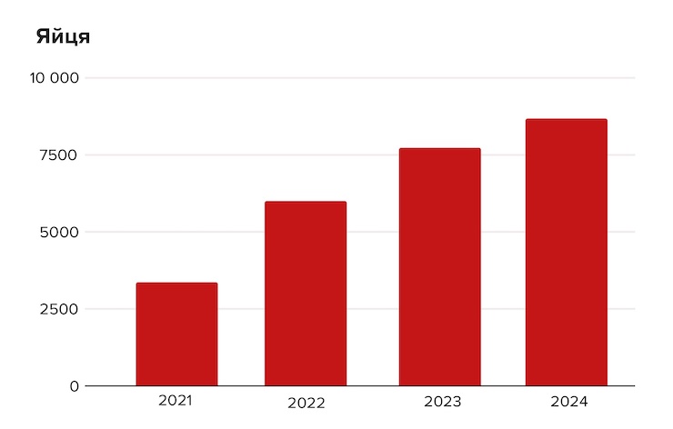 Яйця. Імпорт яєць за останні чотири роки збільшився в 2,5 раза. Торік завезли 8,6 тисяч тонн — переважно з Нідерландів, Чехії та Німеччини. Одним із найбільших у Європі виробництв яєць була Чорнобаївська птахофабрика, що 2022 року опинилася практично на лінії фронту. Зникла електроенергія, зупинилася система подачі корму, мільйони курей загинули від голоду та спраги. Обладнання розграбували й потрощили.