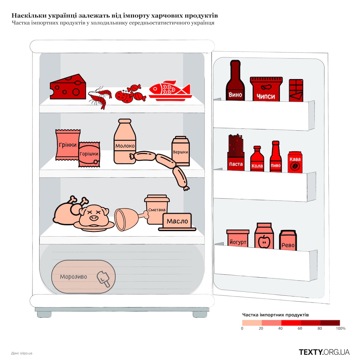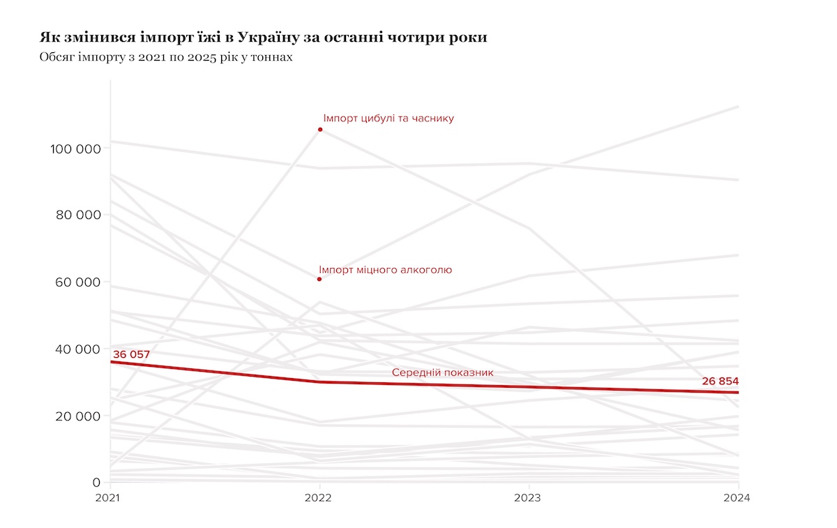 Через війну співвідношення імпорту та локальних продуктів в Україні змінилося, але по-різному для різних харчів. З одного боку, окупація територій, мобілізація та обстріли інфраструктури вплинули на виробництво, але з іншого боку, девальвація гривні зробила імпорт деяких продуктів нерентабельним. Та загалом імпорту за останні три роки стає менше, виявили Texty.org.ua, проаналізувавши понад 500 тисяч найменувань у магазинах «Сільпо» по всій країні.