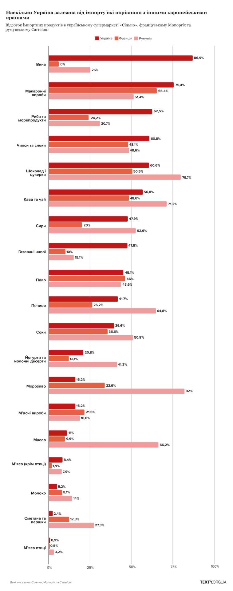 Видання також порівняло частку імпорту різних товарів у супермаркетах України, Франції та Румунії.