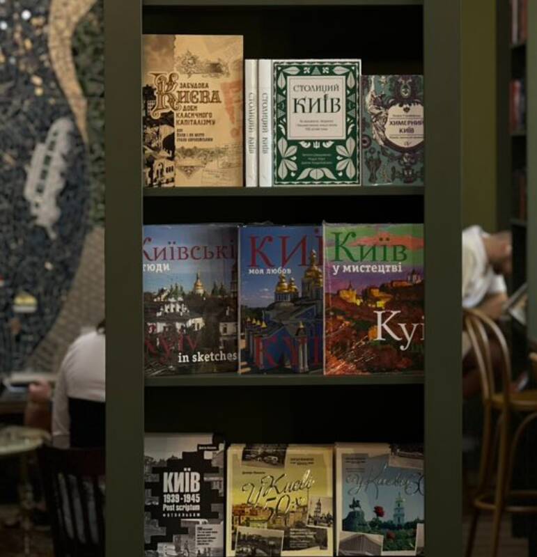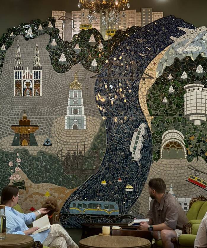 В книгарні є велике мозаїчне панно з київськими будівлями.