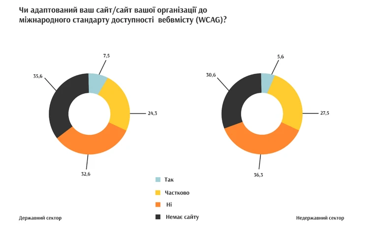 Більшість державних і комунальних закладів навіть не чули про міжнародні стандарти доступності сайтів. (міжнародний стандарт доступності вебвмісту WCAG).