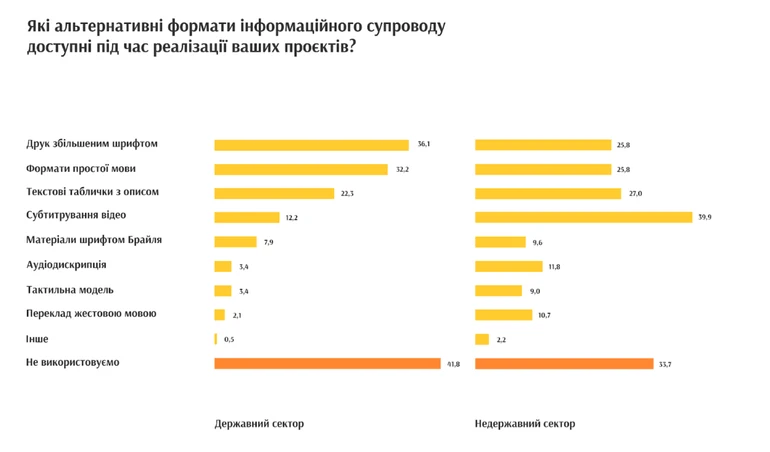 96% державних і комунальних закладів культури та понад 90% представників недержавного сектору кажуть, що враховують потреби різних груп людей. Але найчастіше безбар’єрність впроваджується всупереч всім обставинам і на ентузіазмі окремих людей, без достатнього фінансування і довгострокового плану.