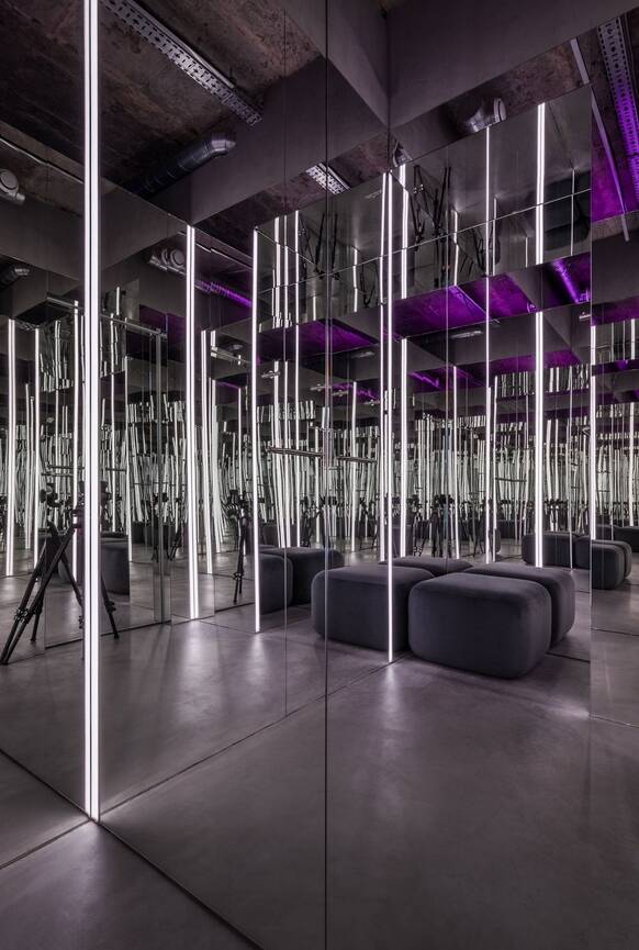 Так у залі залишила стару цеглу, арки й балки, додала бетон, метал, рослини. У чоловічій частині є сейфи, бетон та фотозона з підйомним вішаком. У жіночій зігнуті дзеркала, стіни зі сталевим листом, арт-інсталяція зі старих телевізорів, яка показує зображення відвідувачів зі спецефектами.