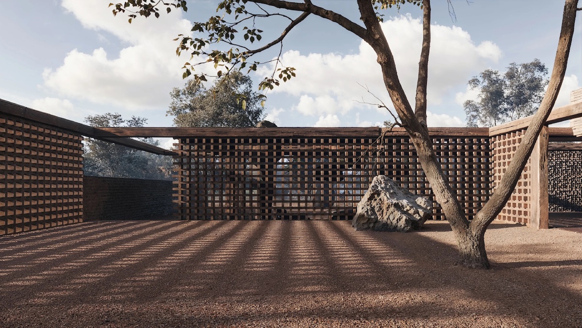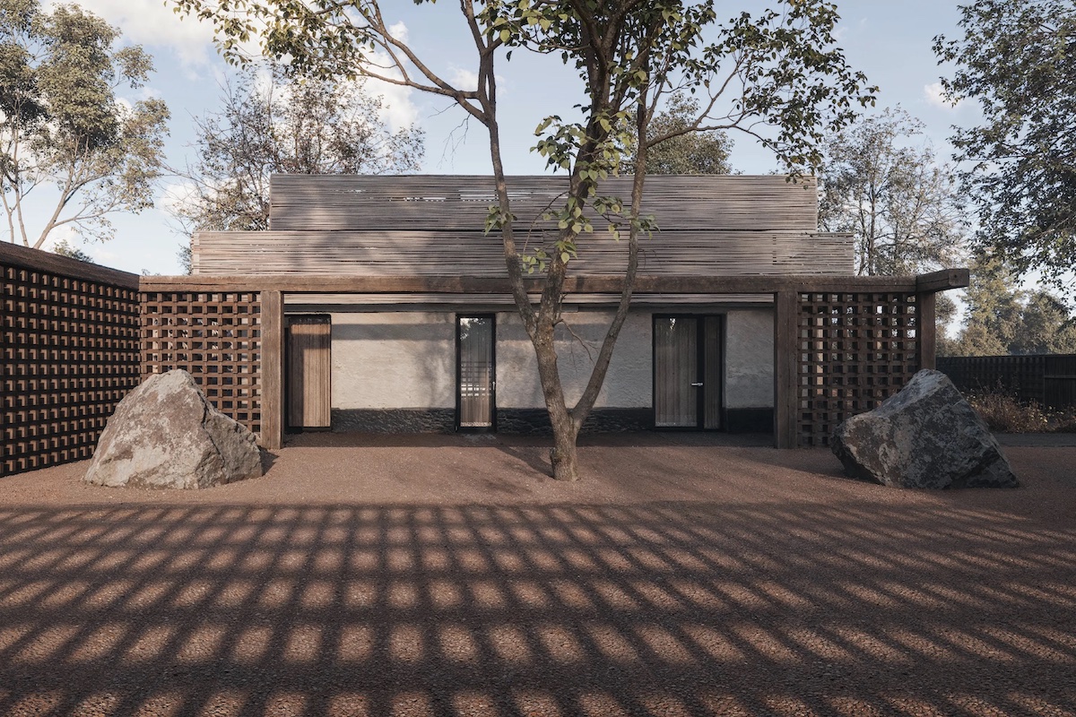 На подвір’ї влаштували медитативний сад каменів, криту терасу і зону вогню. Дерев’яна перегородка фільтрує сонячне світло.