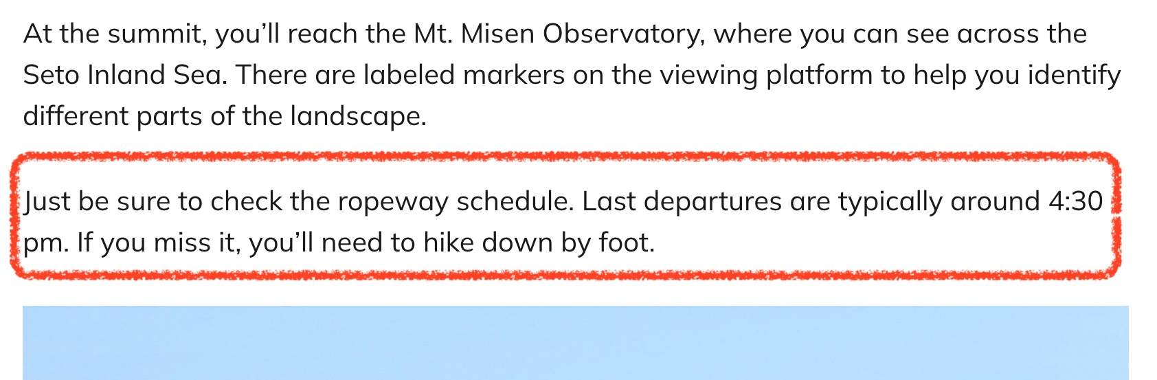 Цьогоріч японська тревелблогерка Дана Яо спланувала зі своїм чоловіком романтичну подорож на гору Місен, що на острові Іцукусіма, за порадами ChatGPT. Пара провела день у місті Міядзіма, а о третій дня почала сходження на гору, щоб зустріти на вершині захід сонця, згідно з інструкціями чату. Чат запевняв, що о 17:30 вони можуть спуститися вниз канатною дорогою, але виявилося, що станція вже була зачинена. Подружжя застрягло на вершині.