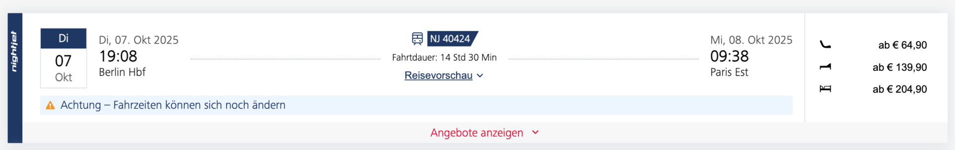 Квиток у стандартний спальний вагон на рейсі Берлін-Париж коштує 140 євро, у купе підвищеного комфорту — 205 євро. Дорога займає 14 годин 30 хвилин: поїзд вирушає з Берліна о сьомій вечора та прибуває до Парижа о 9:38 ранку. Пасажири також мають можливість купити квиток у сидячий вагон за 65 євро, але це означає провести всю ніч сидячи.