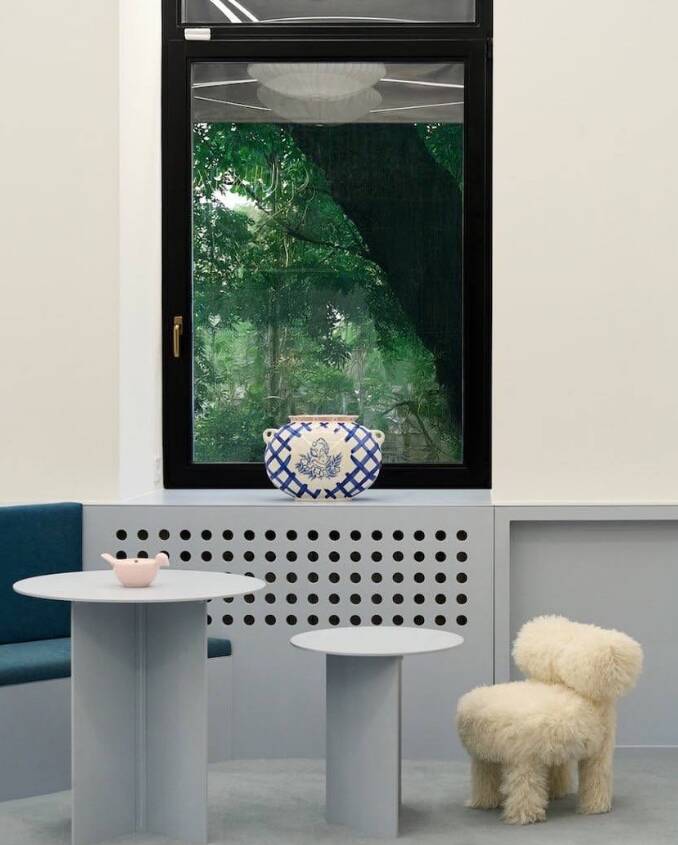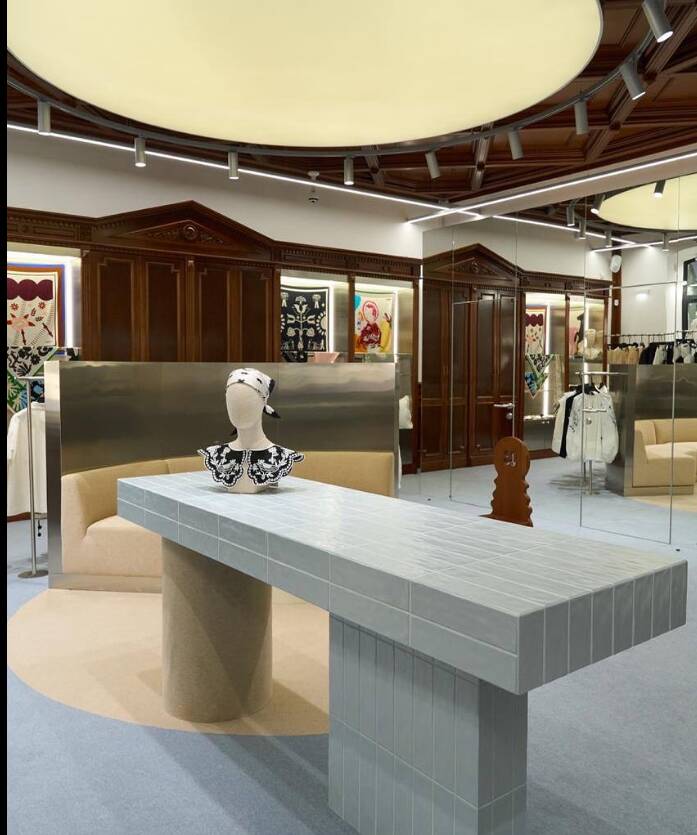 За ідеєю дизайнерки, інтер’єр побудований як подорож садом, із відтінками блакитного, зеленого, рожевого та бежевого. Дзеркала, скло й метал додають легкості, а тепла деревина створює відчуття затишку. Керамічна плитка нагадує про глиняні вироби бренду, а меблі базуються на архівних українських формах, які досліджує Анна Марія Кучеренко.