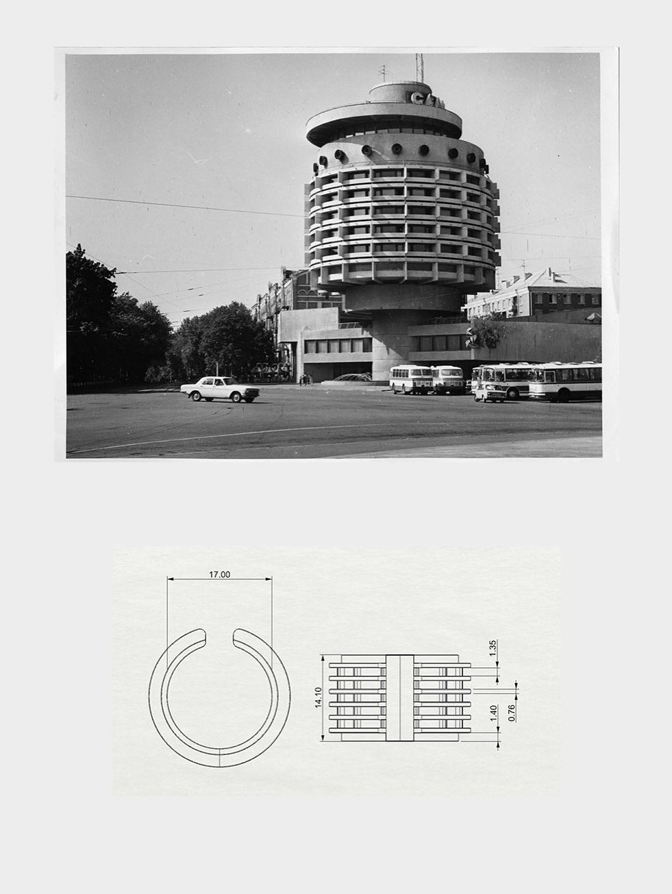 Кільце і каф Saluit повторюють ритм консольних поверхів модерністського готелю «Салют» на вулиці Мазепи в Києві.