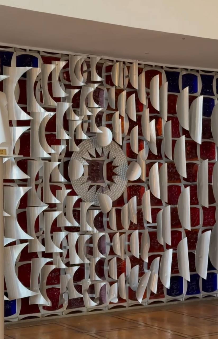 Український дім, споруджений у 1978–1982 роках, став відправною точкою для кольє та брошки, — а саме: міжпілонні простінки, оздоблені білим мармуром.