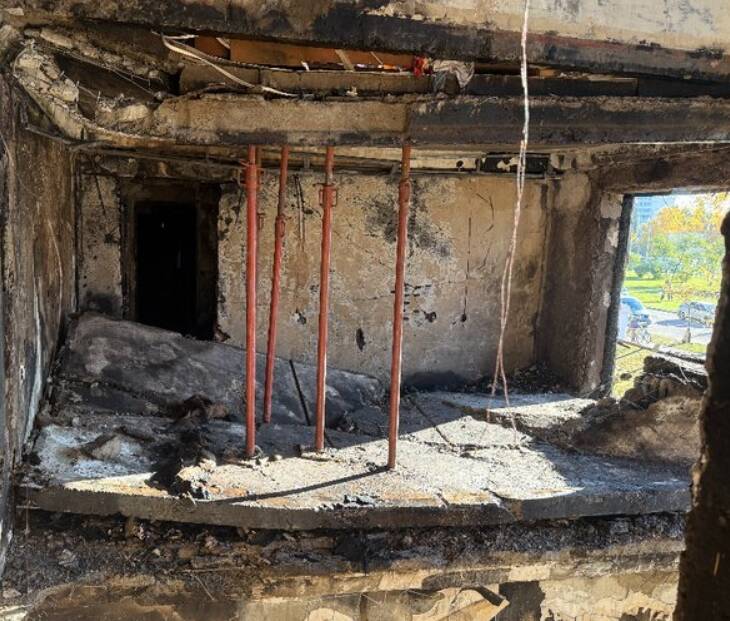У Деснянському районі уламки безпілотника влучили в дев’ятиповерхівку — на рівні другого поверху. Загорілися кілька квартир, вогонь поширився на балкони з четвертого по сьомий поверх.