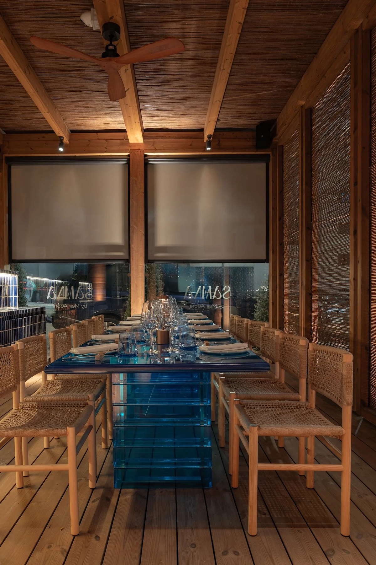 Інтер’єр Samna надихався морем. Головний акцент простору — стельова інсталяція, що нагадує концентричні кола на воді. Її радіальні елементи мають складний воронкоподібний рельєф, підсвічений біодинамічним світлом від студії Expolight. Інсталяція приховує інженерні комунікації та звукоізоляцію.