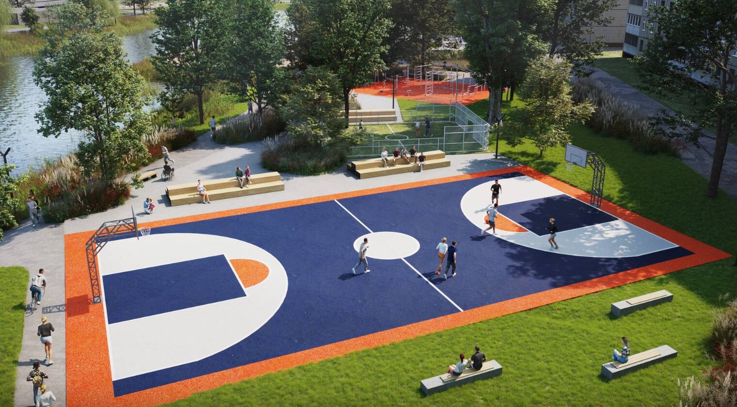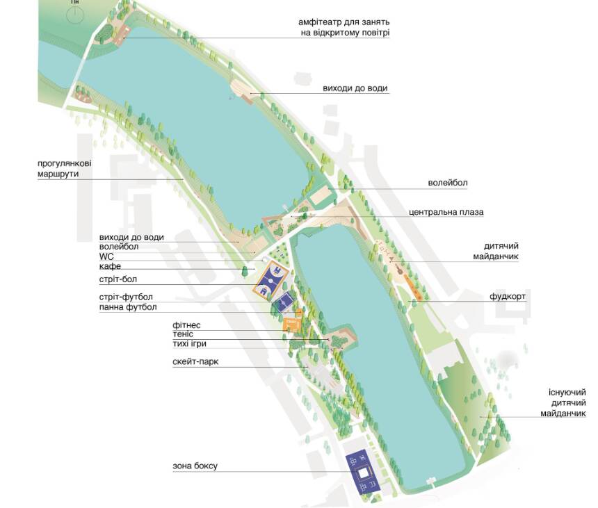 Замість тимчасового обладнання з’являться бетонний скейт-парк, простір для вуличного баскетболу 5х5, великий дитячий майданчик, майданчики для волейболу, панна-футболу, стрит-футболу, боксу, зона фітнесу, центральна площа для івентів та амфітеатр біля води.