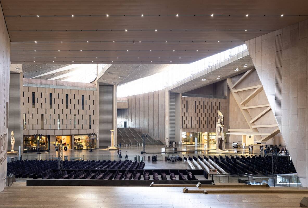 Архітектура музею побудована на системі візуальних і просторових осей, вирівняних із трьома пірамідами. Фасад із напівпрозорого місцевого алебастру формує пустельний бік будівлі, пропускаючи м’яке денне світло й гармонійно поєднуючись із рельєфом місцевості. Усередині — шестиповерховий Великий зал, де під дахом із розсіяним освітленням стоїть 3200-річна статуя Рамзеса II. З цього атріуму ведуть центральні сходи до головної експозиції, звідки відкривається панорамний вид на піраміди крізь високу скляну стіну.