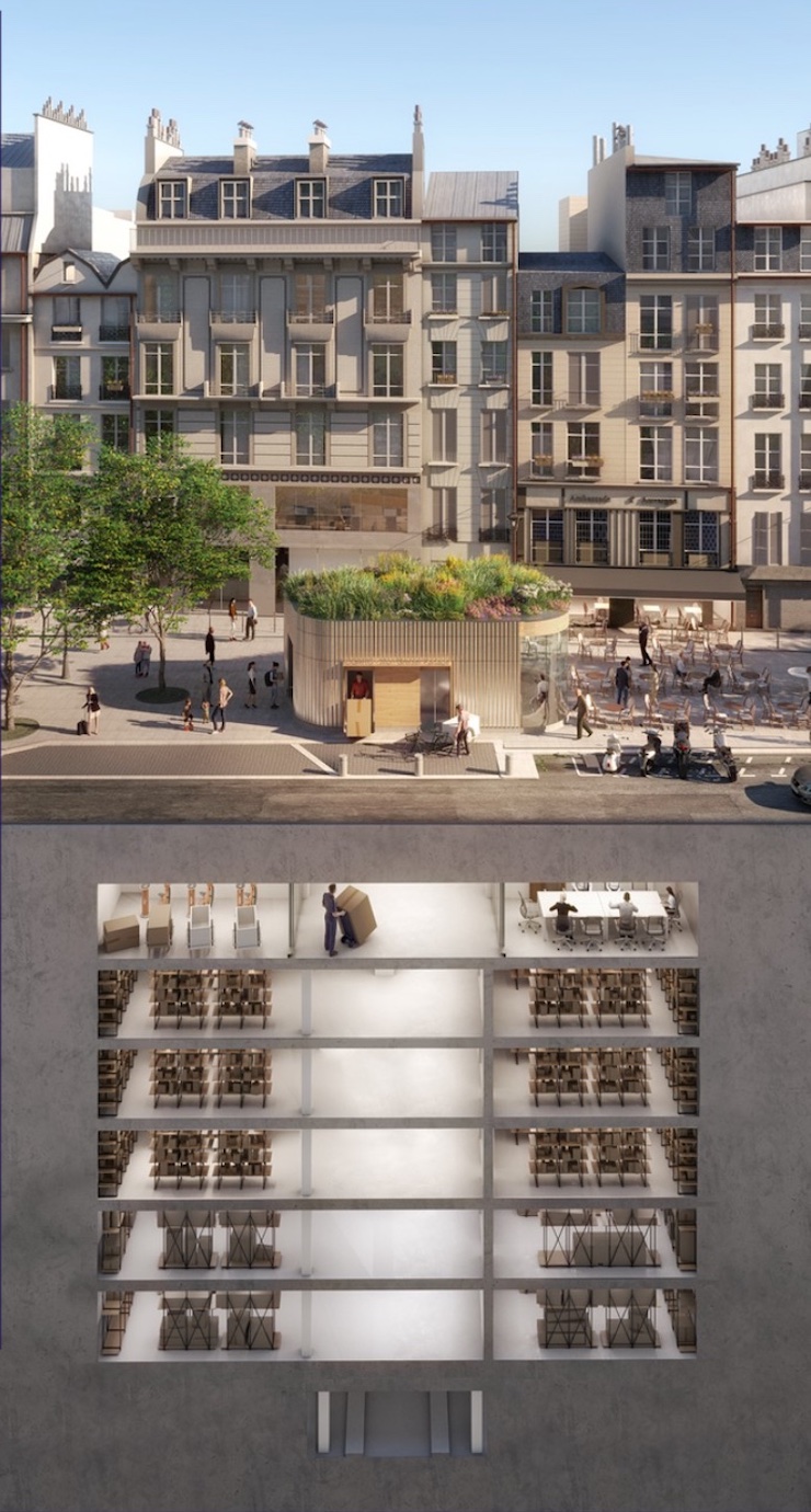 Подібні склади відкриваються й у інших районах, як-от один із комплексів компанії Sogaris біля центру Помпіду: великий кіоск з озелененим дахом, який приховує шестиповерхову підземну інфраструктуру у, знов-таки, колишньому паркінгу. На рівні вулиці він вміщає хімчистку та ремонт велосипедів.