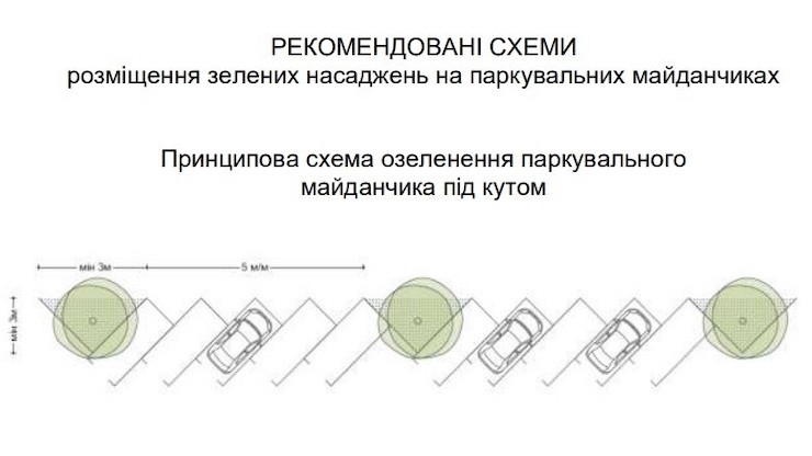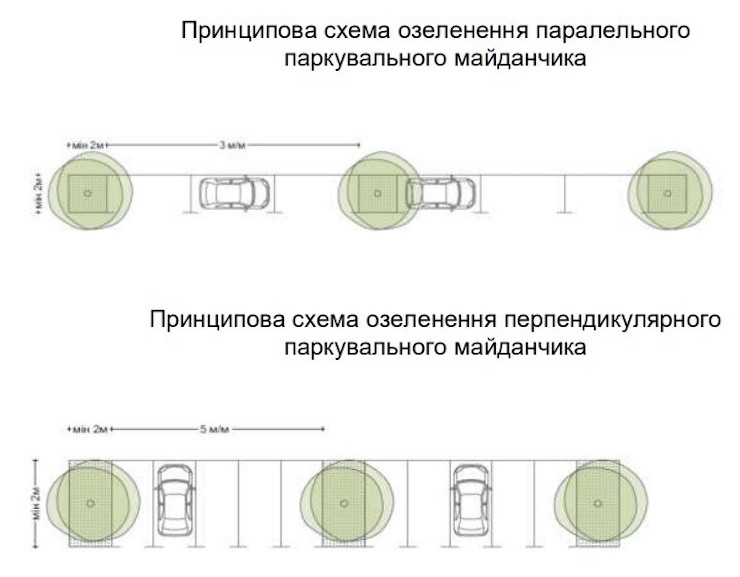 Для перпендикулярного паркування рекомендують висаджувати не менше одного дерева на кожні п’ять машиномісць. Для паралельного — не менше одного дерева на кожні три машиномісця.