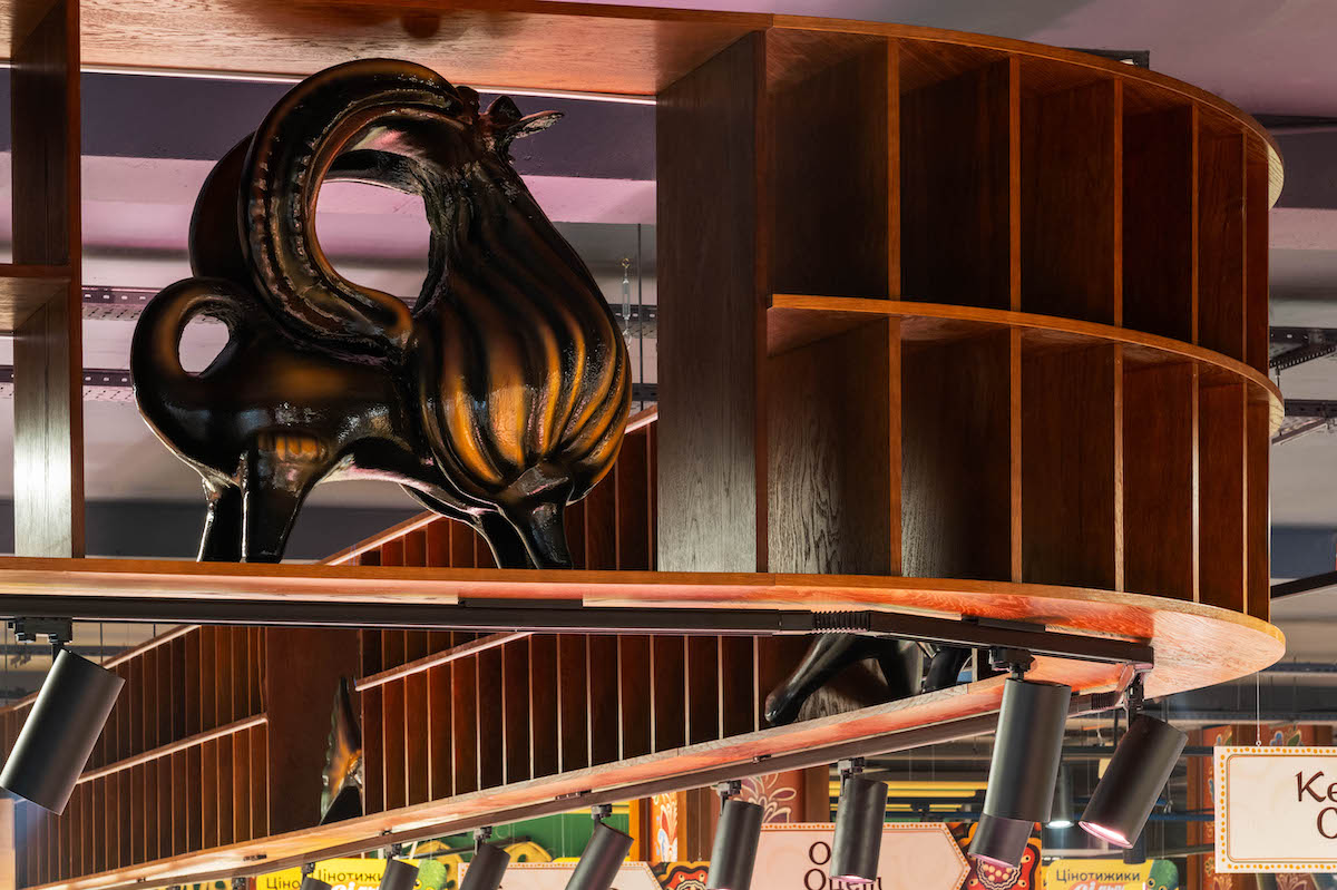 Над відділом садовини та городини розмістили артоб’єкт — гончарне коло, що обертається, та глечики з підсвіткою навколо нього.