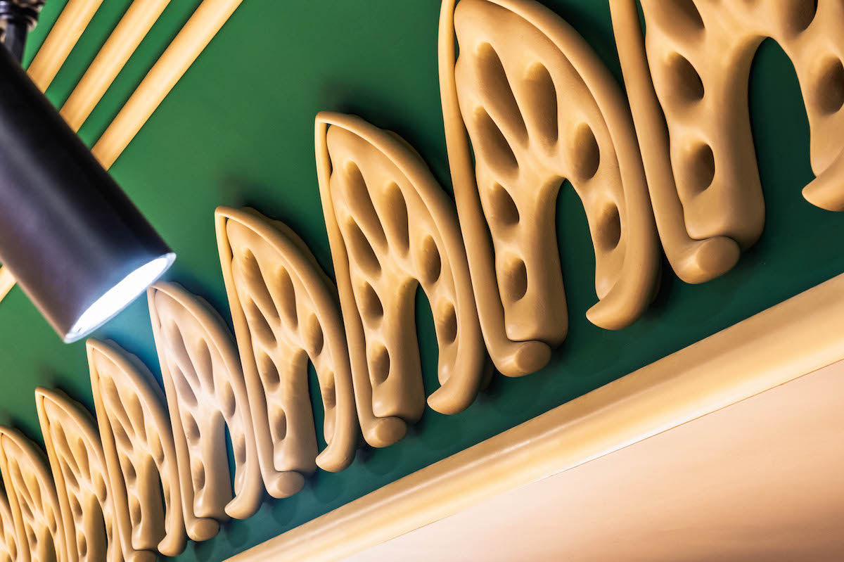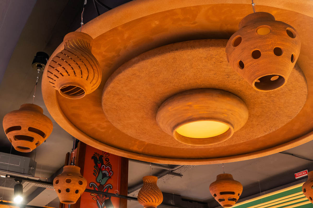 Головний акцент інтер’єру — 16 тарелей, розписаних за ескізами художників Васильківського заводу: Сергія Денисенка, Марини Кривонос, Михайла Денисенка та Володимира Коваленка. Поруч з ними розмістили QR-код, за яким можна прочитати історії митців та більше дізнатися про васильківську майоліку.