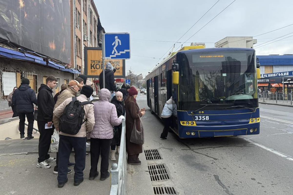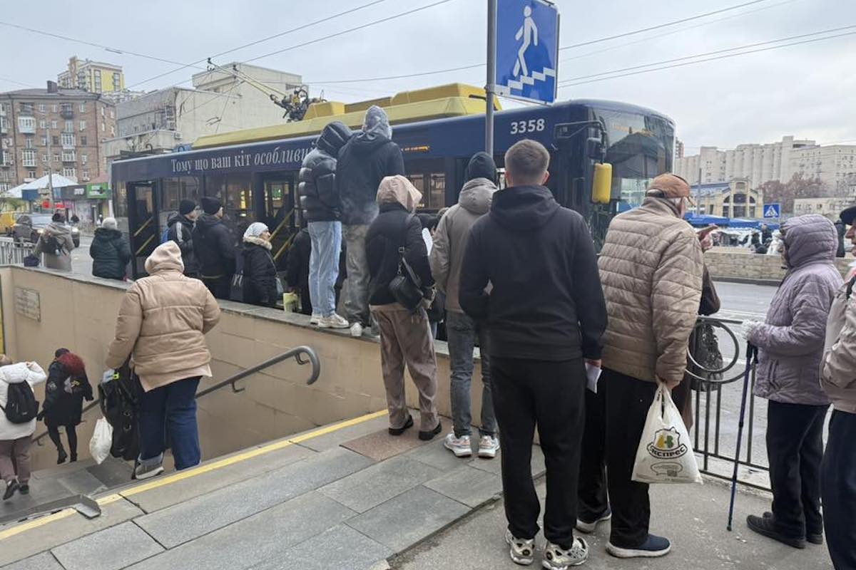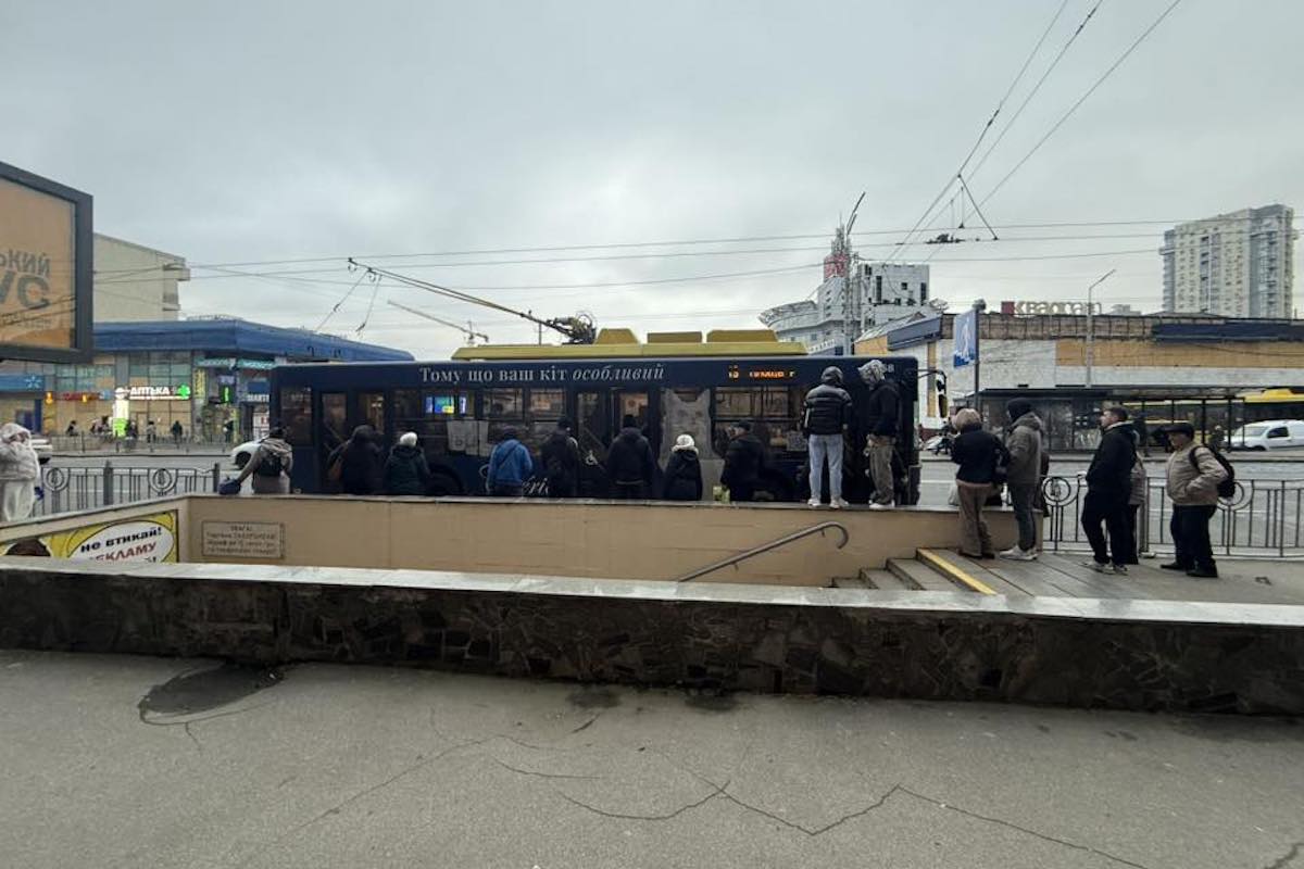 Після російської атаки на Київ 14 листопада заблоковано зупинку громадського транспорту біля метро «Лук’янівська». Та поки комунальники усувають наслідки обстрілу, тролейбуси та маршрутки висаджують пасажирів просто на смузі руху, відгородженій металевим парканом і стіною підземного переходу.