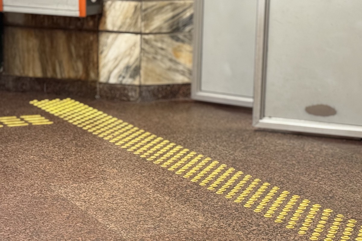 Зазвичай безбар’єрні заходи впроваджують під час ремонту чи реконструкції станцій, однак для нанесення тактильної навігації ремонт не потрібен. Технологія холодного пластику замість тактильної плитки дозволяє швидко нанести смуги без втручання у гранітне покриття.
