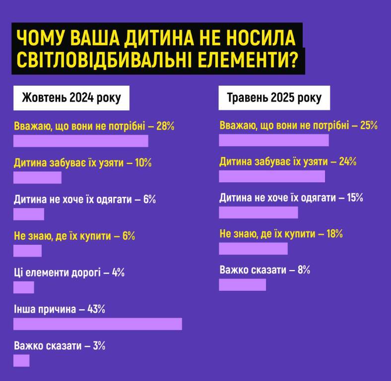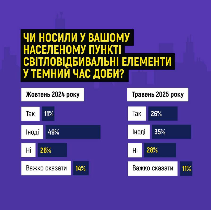 Такі дані оприлюднені згідно з опитуванням, яке проводив Київський міжнародний інститут соціології у травні – червні 2025 року. В опитуванні видно, що хоча більшість батьків погоджуються, що світловідбивальні елементи рятують життя, частина все ще недооцінює їх важливість – понад 80% батьків у 2024 та 2025 роках погоджуються, що флікери рятують життя.