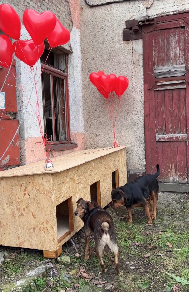 Вночі, коли магазин закритий, собаки ночують на вулиці. Зараз від благодійників отримали будку на три кімнати.