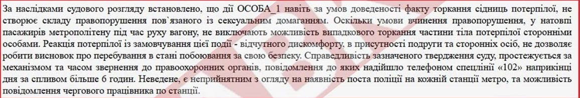 «Дії особи навіть за умов доведеності факту торкання сідниць потерпілої, не створює складу правопорушення, пов’язаного із сексуальним домаганням. Оскільки умови вчинення правопорушення, у натовпі пасажирів метрополітену під час руху вагону, не виключають можливість випадкового торкання частини тіла потерпілої сторонніми особами».