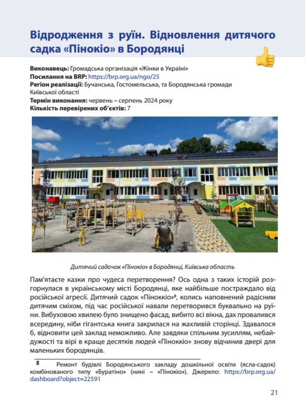 Багато історій у книзі показують, що моніторинг відбудови — це не лише контроль, а й про партнерство та комунікацію з громадами. Наприклад, у історії «Один із дев’яти» розповідається про житлові будинки в Києві, де лише один із дев’яти обстежених об’єктів відбудували краще, ніж було, і це стало можливим завдяки активності самих мешканців.