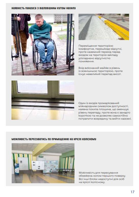 А у «проблемних історіях» згадується ліцей «Мрія» в Ірпені. Після відбудови там встановили сонячну станцію на даху, яка забезпечує енергією школу на п’ять годин під час вимкнень і покриває близько 35% річного споживання. Але жодне з трьох укриттів у школі не доступне для людей на кріслі колісному. Сходи починаються відразу у вестибюлі, вбиральні та ліфти для маломобільних людей відсутні.