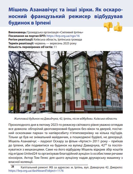 Ще там є історія про те, як оскароносний режисер Мішель Азанавічус допоміг відбудувати сильно пошкоджений житловий будинок в Ірпені, коли мешканці власними силами та зі збором коштів через благодійний аукціон і підтримку United24, відновили покрівлю, стіни, комунікації та фасад.