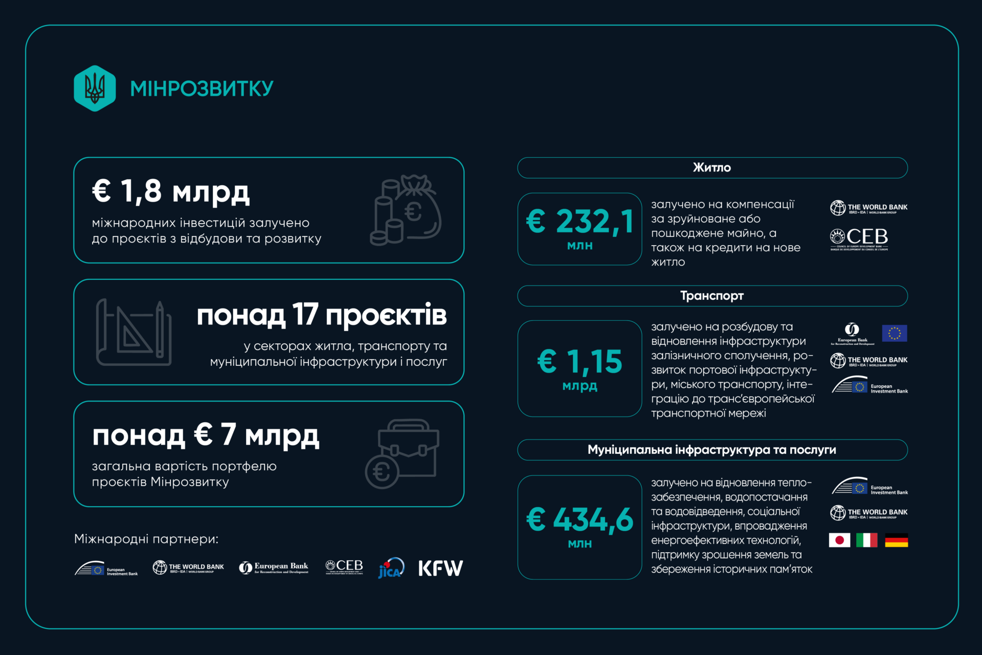 В Міністерстві зазначають, що команда працює над реалізацією державних і спільних із міжнародними партнерами проєктів у житловій, транспортній та муніципальній сферах.